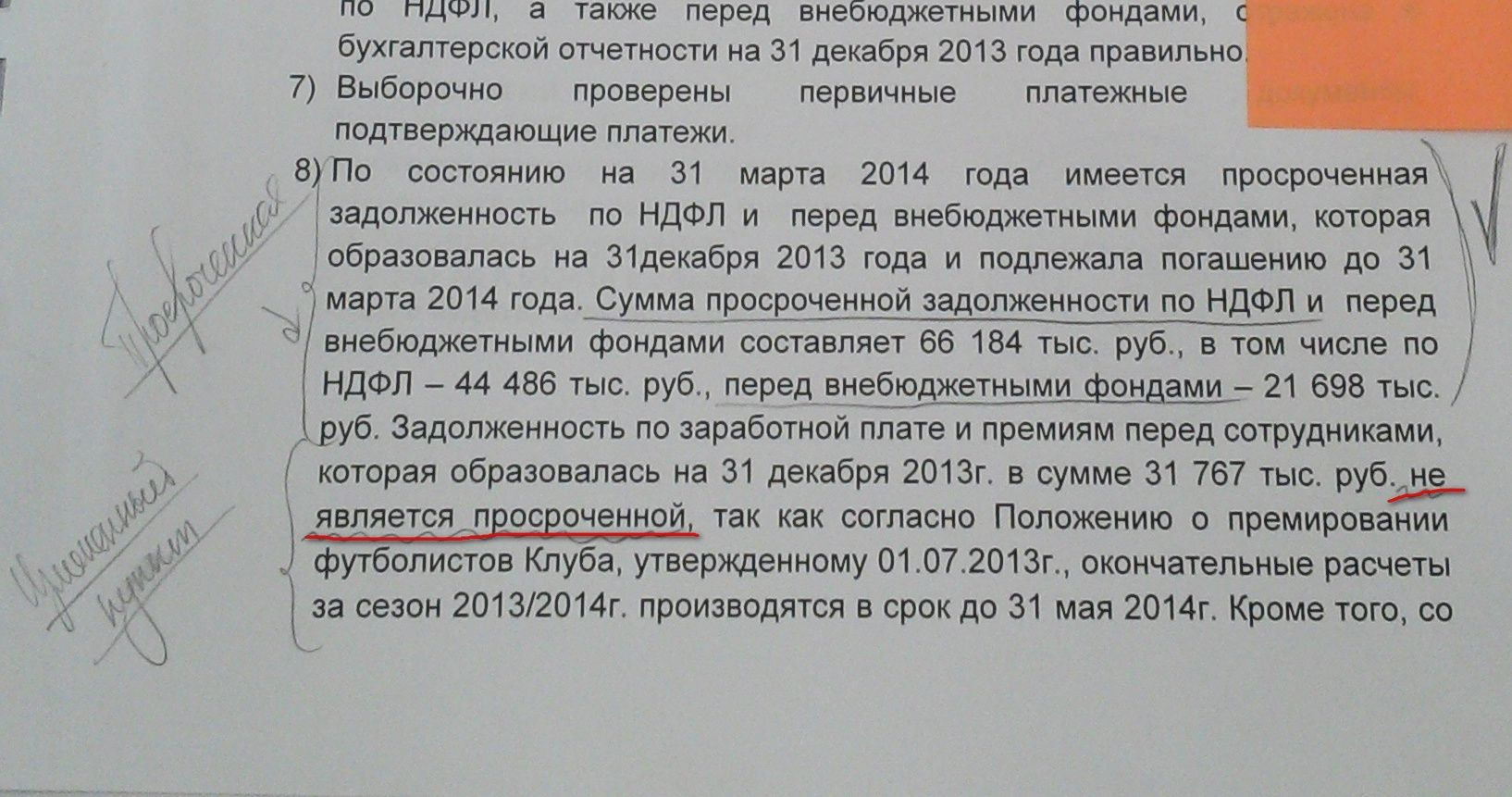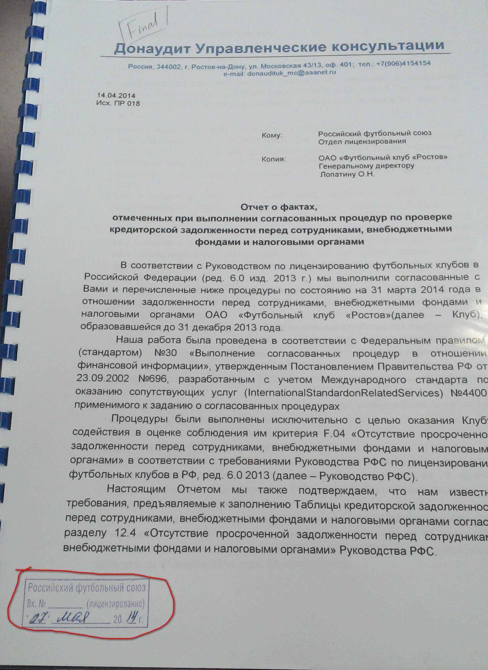 – В РФС пришло письмо из Пенсионного фонда, где "Ростову" давалась отсрочка в погашении долга. Там был указан телефон, по которому мы позвонили. Уточнили статус этого документа. Нас попросили подождать, после чего отозвали письмо, разрешающее отсрочку. Позже управление Пенсионного фонда подтвердило: эта организация не имеет права давать отсрочки по выплатам. А вот данные налоговой проверки клуба, подтверждающие наличие налогового правонарушения. Указана сумма. Какова в таком случае цена бумаги, где было сказано, кто клуб не имеет задолженностей? И кто обязан контролировать финансовую деятельность клуба? Тот, кому принадлежит клуб. То есть администрация Ростовской области, владеющая 90 процентами акция "Ростова". И мы обязательно обратимся к губернатору области с просьбой дать оценку деятельности должностных лиц, представляющих учредителей клуба. Кроме того, уже направлены запросы в пенсионный фонд, министерство по налогам и сборам, а также в генеральную прокуратуру.