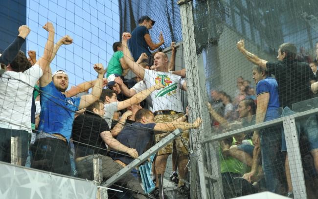 Разумеется, торпедовцы поддались на провокацию. Многие из них полезли на хлипкую баррикаду, отделявшую одних московских фанатов от других. С обеих трибун начали стягиваться дополнительные силы для помощи своим, но ОМОН не дремал и тут. Защитники правопорядка быстро сообразили что к чему, разняли собравшихся и моментально выстроили из своих бронированных тел еще один забор.