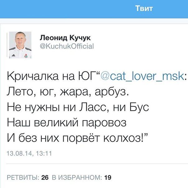 Фейковый твиттер наставника "Локомотива" Леонида Кучука предлагает актуальную летнюю кричалку для фанатов красно-зеленых: