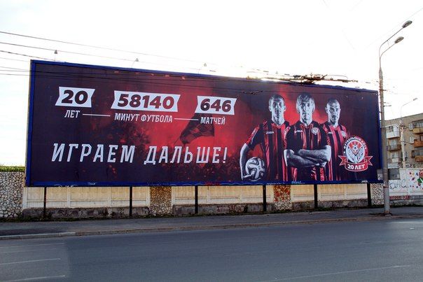Социальная реклама "Амкара", посвященная 20-летию клуба, появилась на площади Карла Маркса в Перми. Ее концепция, по задумке авторов проекта, отражает прошлое, настоящее и будущее красно-черных: "На баннере размером 26х7,5 м и общей площадью 195 кв. м приведена 20-летняя статистика футбольного флагмана региона и изображены трое ведущих футболистов нынешнего основного состава Александр Коломейцев, Дмитрий Белоруков и Георгий Пеев. Всю композицию органично завершает яркий лозунг: "Играем дальше!".