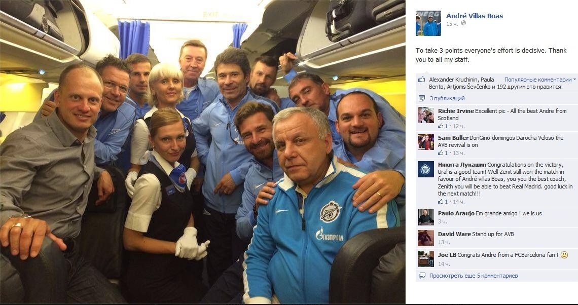 После матча в Екатеринбурге ("Урал" – "Зенит" – 1:2), португальский наставник Андре Виллаш-Боаш на своей странице в социальной сети Facebook поздравил тренерский штаб с тремя набранными очками, поблагодарив каждого из своих помощников: