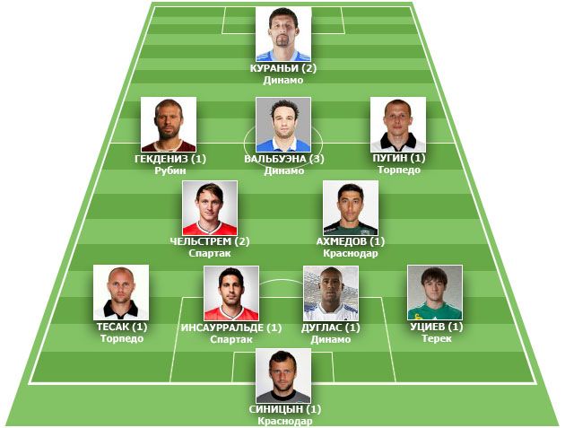 "СЭ" представляет свой вариант символической сборной прошедшего тура. В третий раз подряд в нее попал новичок "Динамо" Матье Вальбуэна, который, собственно, и дебютировал в нашем первенстве три тура назад.