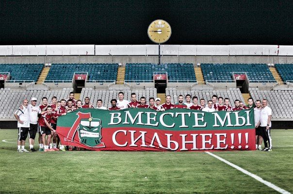За день до первого матча плей-офф Лиги Европы против кипрского "Аполлона" (1:1) футболисты и тренерский штаб "Локомотива" сделали совместный снимок с фанатским баннером: