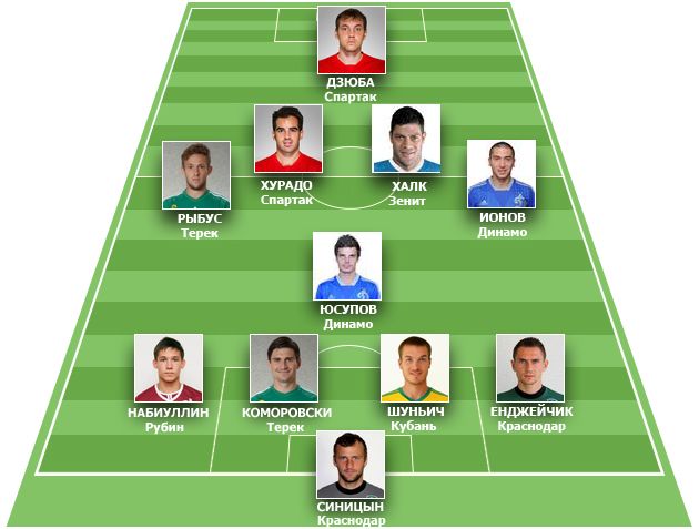 "СЭ" представляет свой вариант символической сборной прошедшего тура. Уже есть старожилы - в третий раз в сборной представлены зенитовец Халк и спартаковец Дзюба. Также отметим второе попадание в 11 лучших двух перспективных россиян - вратаря "Краснодара" Синицына и защитника "Рубина" Набиуллина.