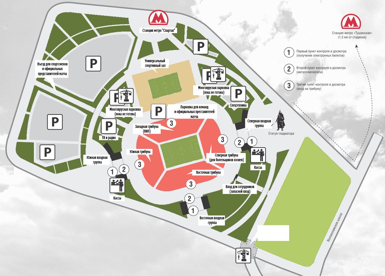 Вместе с новой ареной в эксплуатацию будет введена и станция метро "Спартак". Дойти от нее до нужного сектора не составит и пяти минут – расположена она буквально в трехстах метрах от входов на северную и южную трибуны. При этом в дни матчей станция будет работать только на выход из метро. По окончании спортивных мероприятий болельщикам придется пройти чуть больше километра до "Тушинской". Это позволит избежать давки, пояснили в управлении московского метрополитена.