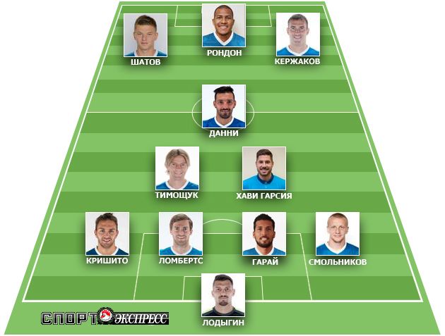 Теперь переходим ко второму варианту – с двумя опорниками в лице тех же Хави Гарсии и Тимощука. При таком раскладе над ними вполне способен сыграть Витсель, на правом фланге Шатов, на левом Данни. Проблема же лимита решается за счет Кержакова в центре нападения.