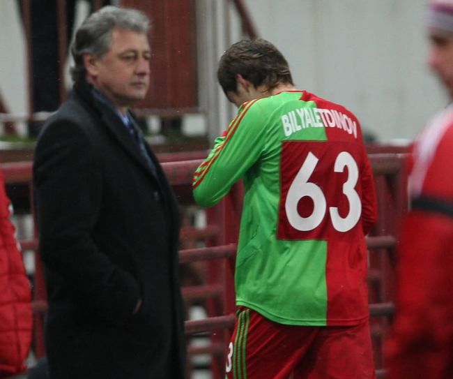 29 ноября 2007 года. Москва. "Локомотив" - "Копенгаген" - 0:1. И.о.главного тренера "Локомотива" Ринат БИЛЯЛЕТДИНОВ (слева) и полузащитник красно-зеленых Динияр БИЛЯЛЕТДИНОВ. Фото - Александр ФЕДОРОВ, "СЭ"