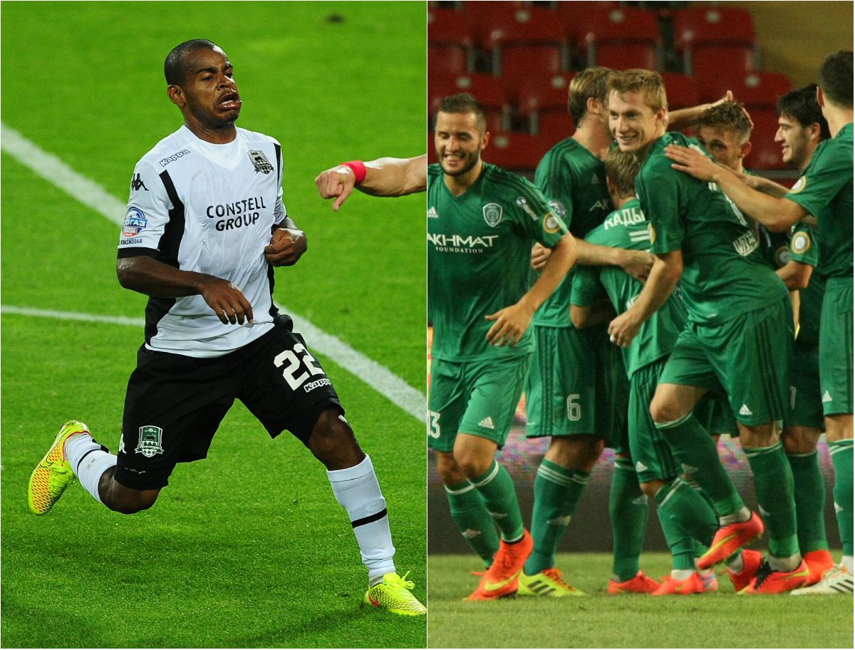 Хавбек "Краснодара" ЖОАУЗИНЬЮ (слева) и футболисты грозненского "Терека". Фото Антон СЕРГИЕНКО, "СЭ" / Мурад БАЦУЕВ