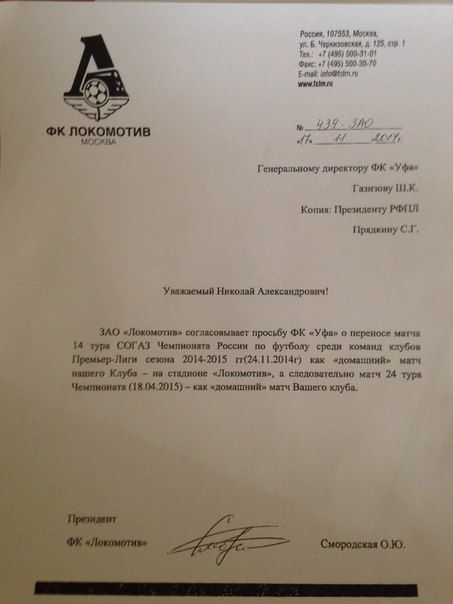 Матч "Локомотив" – "Уфа" должен был состояться в Перми, однако - да, да - все та же комиссия по сертификации стадионов РФС по итогам проверки понизила стадиону "Звезда" категорию сертификата соответствия союза с "первой" до "второй". После чего "Уфа" предложила железнодорожникам поменяться турами (24 ноября команды сыграют в Москве, 18 апреля следующего года – в столице Башкирии). "Локомотив" предложение принял и ответил... Николай Александровичу (видимо, Толстых).