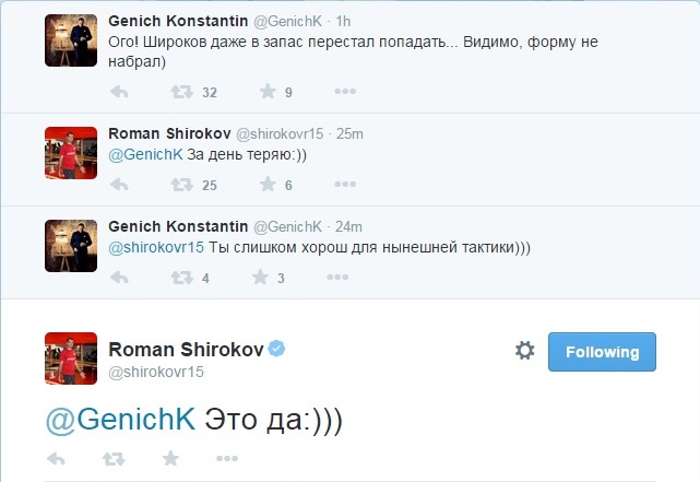 Однако с ней оказался не согласен…сам Широков. До матча он позволил себе пару ироничных твитов в беседе с комментатором Констатином Геничем. "За день форму теряю", – написал он и добавил несколько "смайлов".