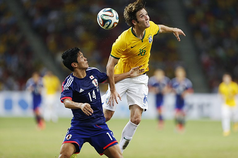 14 октября 2014 года. Сингапур. Япония - Бразилия - 0:4. В борьбе за мяч МАРИУ ФЕРНАНДЕС.