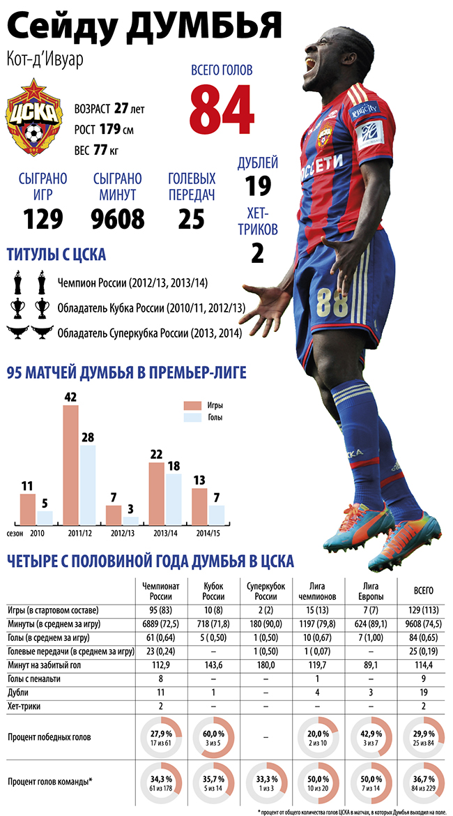 При этом в двух последних чемпионатах у Думбья очень высокая реализация ударов. Голом заканчивался каждый четвертый удар по воротам в исполнении лидера атак ЦСКА и каждый второй в створ. Всего в 26 матчах сезона-2013/14 и 2014/15 ивуариец записал на свой счет 24 мяча, пробив по воротам 89 раз (голами стали 27,0% ударов) и 43 раза попав в створ (55,8%).
