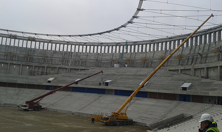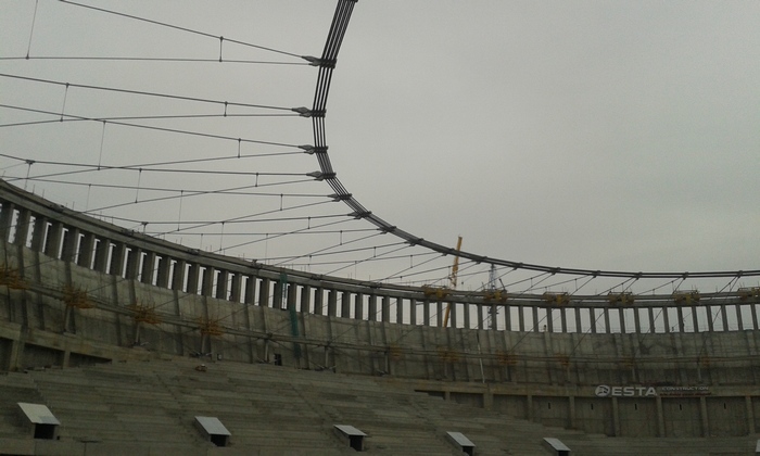 Они привели гостей на Западную трибуну, в зону, где будет находиться президентская ложа, чтобы оттуда все рассказы о ходе строительства подкреплять наглядной демонстрацией. Вид оттуда открывается чудесный и охватывает практически всю эту уникальную чашу стадиона целиком.