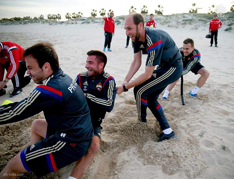 Не менее увлекательны занятия армейцев. Игроки ЦСКА, находящиеся на сборе в испанском Сан-Педро, одну из тренировок провели на пляже, где сыграли в теннисбол, а также организовали несколько матчей "4 на 4" с маленькими воротами и продолжили выявление сильнейшей команды с помощью перетягивания каната.