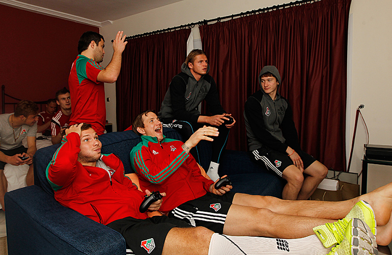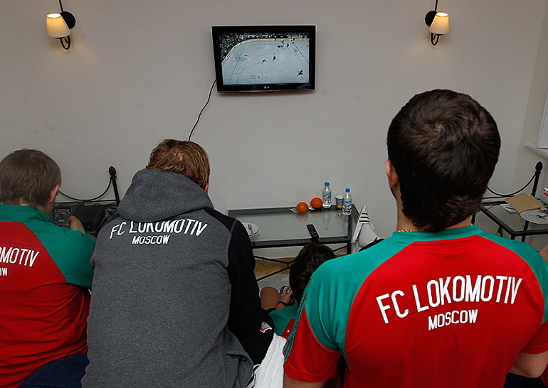 После двустороннего матча на очередной тренировке футболисты "Локомотива" решили отдохнуть за компьютерными играми. При этом железнодорожники, находящиеся в Испании, предпочли симулятору привычного вида спорта хоккей.