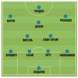 "Зенит" (Санкт-Петербург): 1. Лодыгин – 19. Смольников, 24. Гарай, 13. Нету, 4. Кришито – 5. Рязанцев, 21. Хави Гарсия, 28. Витсель, 35. Данни (к) (7. Халк, 83), 17. Шатов (8. Могилевец, 79) – 23. Рондон (90. Шейдаев, 86).