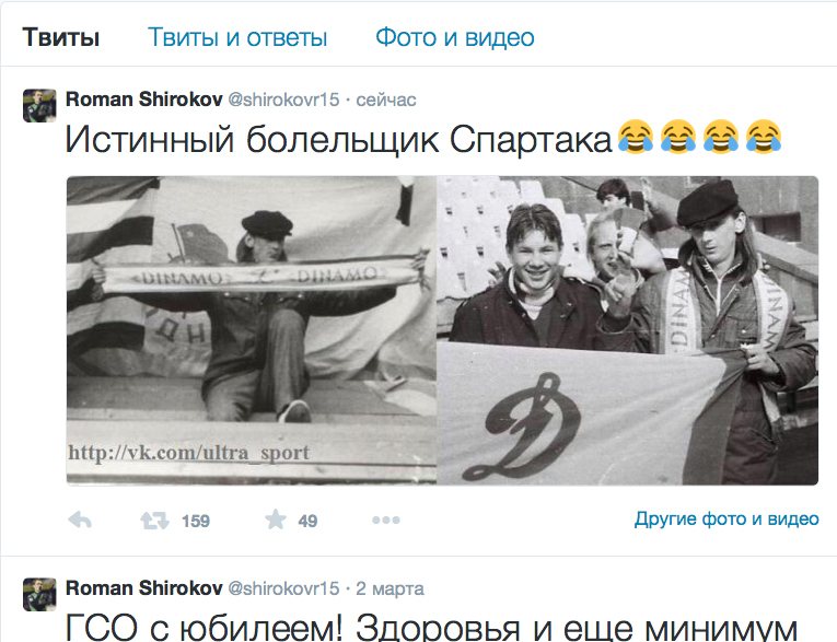 Согласитесь, если все списать на эмоции, то демарш уже не выглядит хорошо спланированной акцией. И можно было бы подыграть агенту, спустить все на тормозах, сказать что-то примирительное, но вместо этого Широков, увидев острую и местами вышедшую за рамки цивилизованного обмена мнениями реакцию Федуна, выложил вчера вечером в твиттер старые фотографии президента с флагами киевского "Динамо". И подписью – "Истинный болельщик "Спартака". Думаю, этим футболист сжег все мосты.
