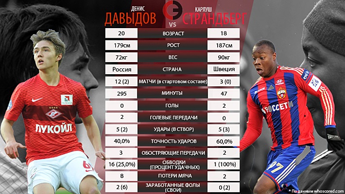Между тем, в составе ЦСКА уже в двух играх подряд забивает Карлуш Страндберг (родился 14 апреля 1996 года), швед мозамбикского происхождения, купленный зимой из клуба "Хеккен". И если "благодаря" Леониду Федуну к Денису приклеился ярлык "спартаковский Месси" (дословно было сказано "у нас подрастает свой Месси, Давыдов"), то прозвища Страндберга - "Зверь" и "новый Балотелли" - в России пока что упоминаются редко. Это, однако, не мешает ему выполнять ключевую задачу любого нападающего.