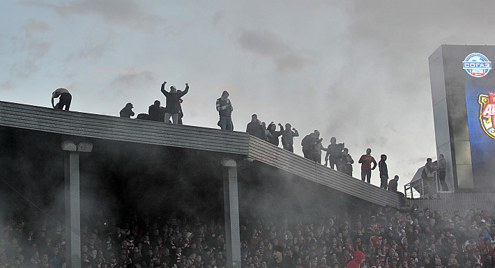 Устаревшей конструкцией стадиона воспользовались около 15 "людей-пауков". Один из них пробежал поверху от фанатской трибуны до центральной и свесился над удивленными туляками. Погримасничав и наигравшись в эквилибриста, взобрался обратно. Другие "скалолазы" просто прогуливались по козырьку южной трибуны. Диктор по стадиону неоднократно просил их покинуть опасную зону, грозил, что матч будет остановлен. А полицейские, которые с подобным столкнулись впервые, хотя и поднялись, но стояли поодаль – потасовка на крыше грозила страшными последствиями.