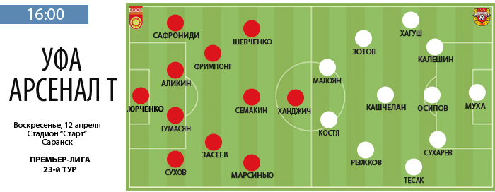 Оздоев (дисквалификация), Канунников, Соболев (травм.) |