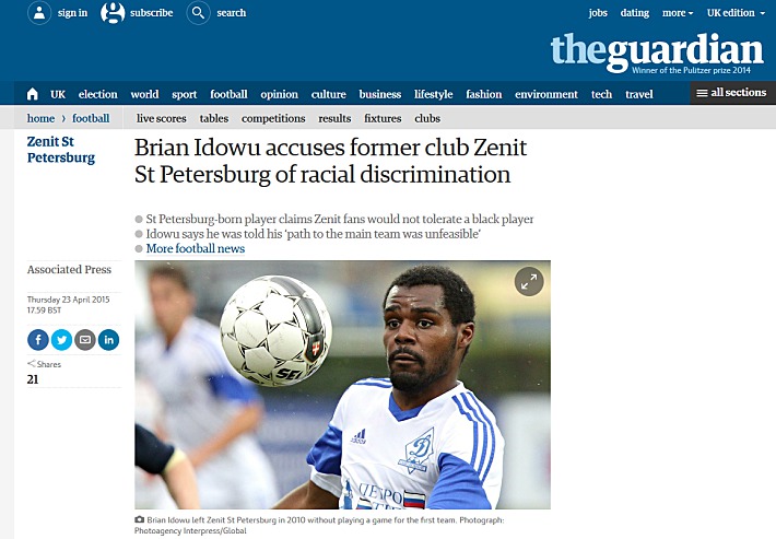 К вечеру новостями о расизме в "Зените" пестрели американские агентства Associated Press и USA Today, британская The Guardian, итальянские Tuttosport и ANSA. Не обошли эту тему и в Индии. К слову, на Западе неоднократно тиражировались новости, связанные с дискриминацией игроков по цвету кожи в России. Особенно в этом отличились СМИ Великобритании. В свое время много шума наделали слова главного тренера "Ростова" Игоря Гамулы о черных футболистах, заявление наставника "Зенита" Андре Виллаш-Боаша об уханье фанатами "Торпедо" в адрес Халка, бросание бананов в Роберто Карлоса и Самюэля Это'О.
