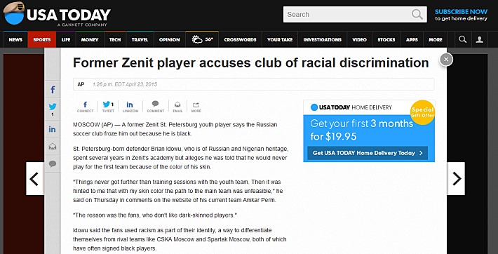 USA Today замечает: "В то время как две звезды "Зенита" – бразильский нападающий Халк и бельгийский полузащитник Аксель Витсель – представители смешанной расы, в клубе никогда не было футболистов из африканских стран".