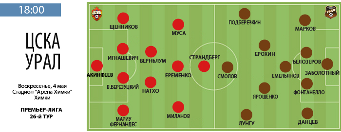 В матче с "Уралом" в стартовый состав армейцев должен вернуться полузащитник Роман Еременко. Он, напомним, пропустил матч 1/2 финала Кубка России против "Кубани" (0:1) из-за дисквалификации. Пока команда была в Краснодаре, Еременко тренировался индивидуально. Однако к "Уралу" он готовился в общей группе. Сегодня главный тренер ЦСКА Леонид Слуцкий празднует 44-й день рождения. Клуб уже поздравил наставника на клубном сайте, но каков подарок – станет известно лишь после финального свистка. |