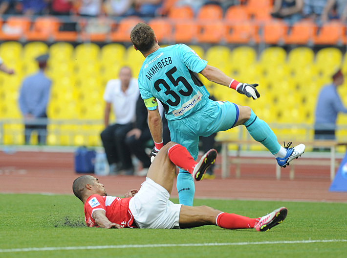 28 августа 2011 года. Москва. "Спартак" - ЦСКА - 2:2. В результате столкновения с форвардом красно-белых ВЕЛЛИТОНОМ вратарь ЦСКА Игорь АКИНФЕЕВ получил травму крестоообразной связки, выбыв на долгий срок. Фото - Никита УСПЕНСКИЙ, "СЭ"