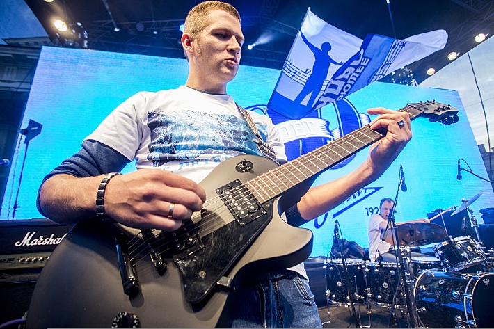Ближе к восьми часам над Ростральными колоннами взмыл в небо огромный воздушный змей с эмблемой "Зенита" и большой золотой звездой – 90-летие петербуржцы встречают с долгожданным прибавлением в символике. Праздничный концерт открыли панки из "Бригадного подряда" и пока первые ряды резво подпрыгивали под гитарные риффы, оставшиеся чуть в стороне болельщики ломали голову над тем, кто из игроков посетит мероприятие.