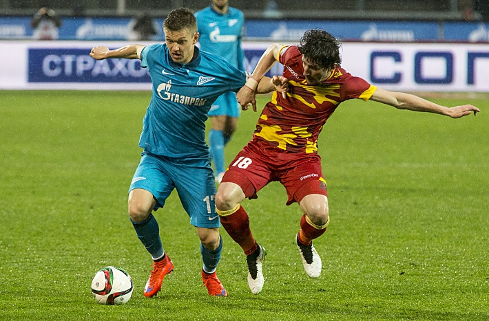 26 апреля 2015. Младен КАШЧЕЛАН в борьбе за мяч с Олегом ШАТОВЫМ. Фото - Вячеслав ЕВДОКИМОВ, ФК "Зенит"