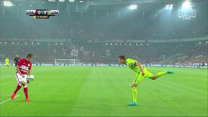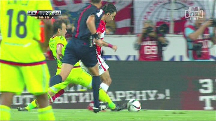 На 36-й минуте в штрафной площади гостей упал Ивелин Попов. Ситуация не самая простая для оценки: в динамике действительно могло показаться, что Бибрас Натхо не коснулся мяча и сфолил на спартаковце. Однако на самом деле один из видеоповторов свидетельствует в пользу полузащитника ЦСКА: сначала он сыграл в мяч. Об этом, кстати, Натхо и говорил Мешкову. Промах арбитра повлечет за собой значительное снижение оценки его работы: вплоть до "неуда".