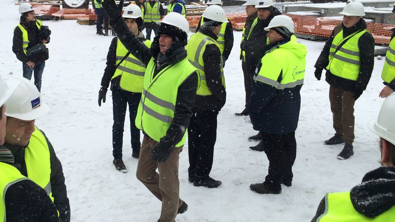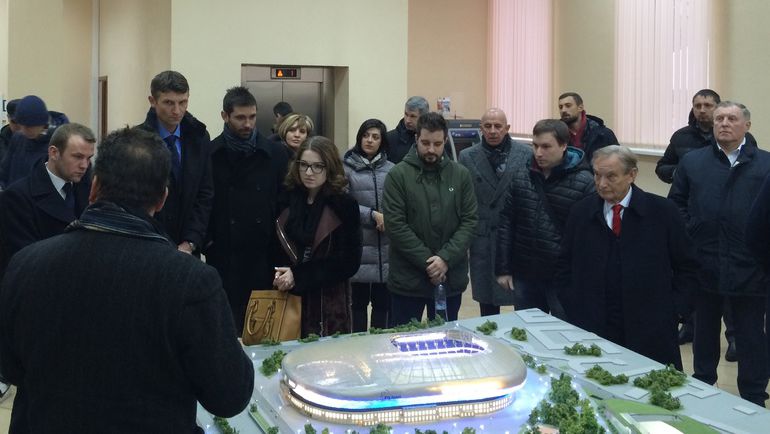 Прежде чем отправиться на стройплощадку, гости выслушали подробный рассказ пресс-секретаря "ВТБ Арена Парк" Михаила Смирнова об этом уникальном проекте, разглядывали красочный макет. Валерий Маслов с улыбкой указывал, в каком уголке парка раньше росли грибы, а Кен Фрайер интересовался, что будет располагаться в жилом квартале, который также станет частью большого проекта "ВТБ Арены Парк". В это время заместитель исполнительного директора бело-голубых Алексей Смертин делился с британскими коллегами воспоминаниями о работе Харри Реднаппа в "Портсмуте":