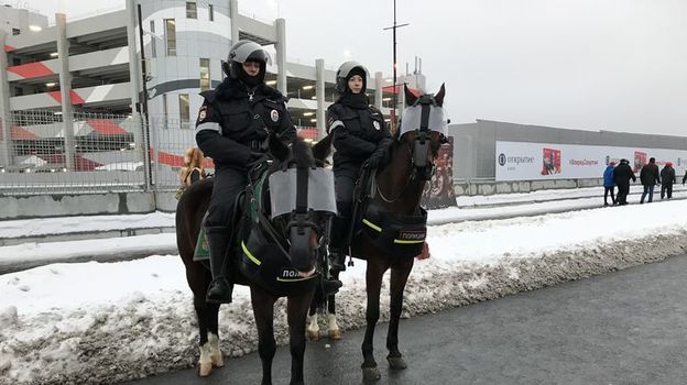 Футболисты "Спартака" занимают дальнюю от этой инсталляции половину поля, так что перед матчем видят ее во всей красе. Фанаты ЦСКА – те, которых не задержали полицейские на входе – довольствуются футболками с цифрами "7:0" и стараются не замечать вражеского творчества. Примерно как полицейские лошади, которые дежурили вокруг "Открытие Арены" перед матчем.