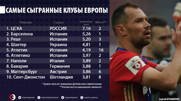 Полтора года назад, зимой 2016-го, рейтинг швейцарских аналитиков уже демонстрировал, что наибольшим постоянством во всей Европе отличается именно состав ЦСКА. Для этого было подсчитано среднее количество лет, проведенных футболистами в первой команде. Армейцы, который год использующие в основе одних и тех же футболистов, тогда были во главе списка и тогда. Остались там и сейчас, обогнав на этот раз "Барселону" и "Реал"!