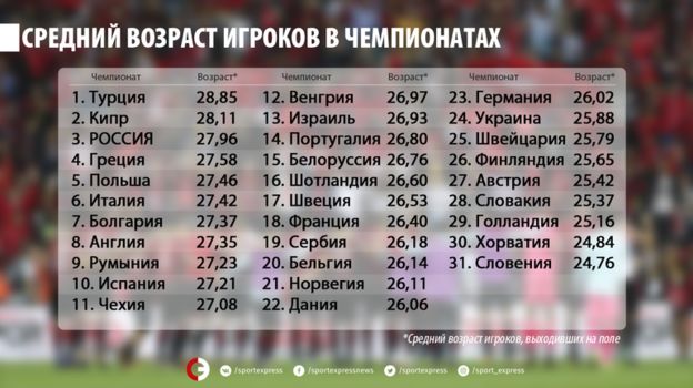 В рейтинге самых возрастных чемпионатов, рассчитанном по среднему возрасту игроков, выходивших на поле, российская премьер-лига заняла третье место – после Турции и Кипра.