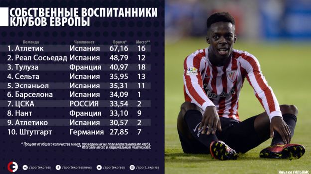 В топ-6 главных европейских лиг (Испания, Англия, Италия, Германия, Франция и Россия) лидируют "Атлетик" из Бильбао, традиционно делающий ставку на игроков с баскскими корнями, "Реал Сосьедад" и "Тулуза". В десятке лучших клубов из топ-6 по игровому времени своих воспитанников вновь находим ЦСКА!