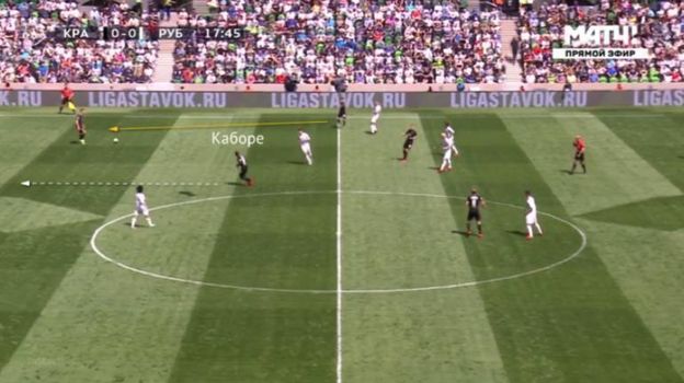 Мяч возвращают центральным защитникам. "Рубин" готов прессинговать два в два, при этом играет узко в обороне. Каборе опускается третьим в линию защиты, за счет этого Мартынович поднимается со своей позиции и делает движение во фланг.