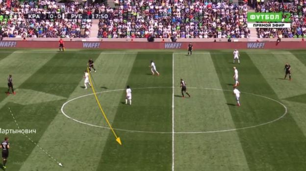 Теперь у Мартыновича есть пространство для развития атаки и несколько вариантов для передачи. Это как пас в атакующую зону на Ари или Вандерсона, которые могут принять между линий, так и Петров справа. В итоге следует пас на бразильца, который в касание выводит Вандерсона один на один с вратарем.