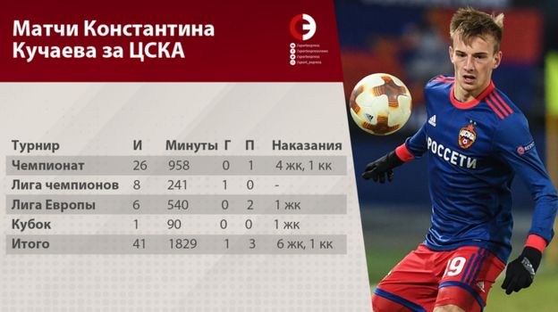 В основном составе ЦСКА Константин Кучаев дебютировал в апреле 2017 года в домашнем матче против "Крыльев Советов". С тех пор полузащитник провел за армейцев 41 матч во всех турнирах и отметился в них одним голом и тремя передачами. Интересно, что единственный мяч Кучаев забил в ворота "Манчестер Юнайтед" в Лиге чемпионов. В молодежном первенстве России хавбек отметился шестью голами в 47 встречах.