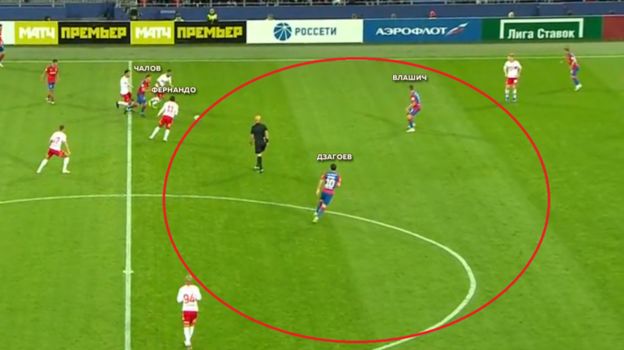 Влашич посылает мяч на линию штрафной площади. В опорной зоне "Спартаке" вновь никого нет, кроме игроков соперника. Дзагоев бьет и попадает в перекладину.