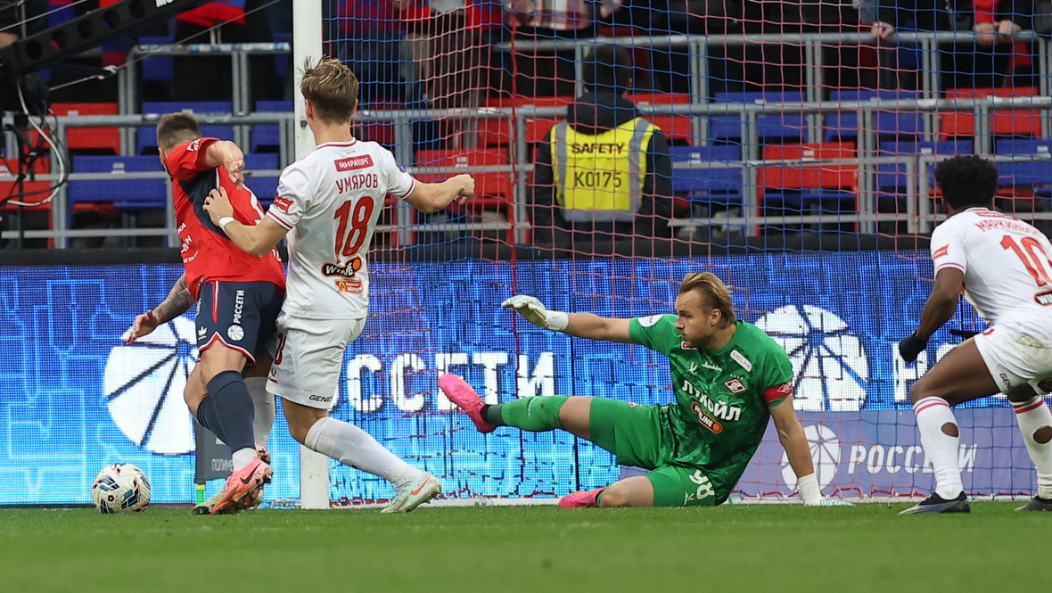 А на 18-й минуте счет стал 3:0 в пользу ЦСКА: Алеррандро пасом запустил в штрафную Глебова, Кириллу не позволил пробить Руслан Литвинов, но мяч отскочил обратно к бразильцу, который наносил удар под дальнюю штангу, а во вратарской из-под Наиля Умярова по-хоккейному подправил Данил Круговой.