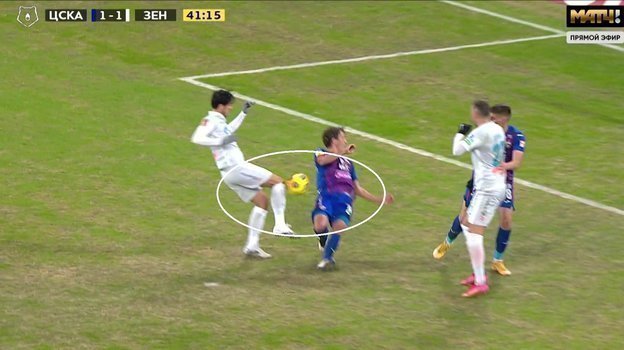На 41-й минуте в штрафной площади красно-синих произошел контакт мяча с рукой Мариу Фернандеса. Рука находилась в неестественном положении, увеличивала площадь тела. Мяч попал в руку от колена Сердара Азмуна. Однако арбитр Евгений Кукуляк ошибочно не назначил пенальти.