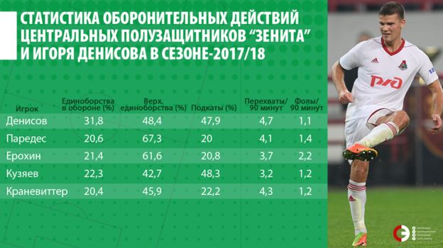 С верховыми дуэлями Денисову трудно совладать – его рост не позволяет выигрывать даже половину единоборств в воздухе. Но это и не так важно для опорного хавбека – куда интереснее, что по среднему числу перехватов на 90 минут Денисов превосходит и Паредеса, и Ерохина, и Краневиттера, и Кузяева, а последнему незначительно уступает по проценту успешных подкатов. При этом хавбек "Локо" редко нарушает правила – в два раза реже Ерохина, который фактически занимает место Денисова в "Зените" и сборной России.