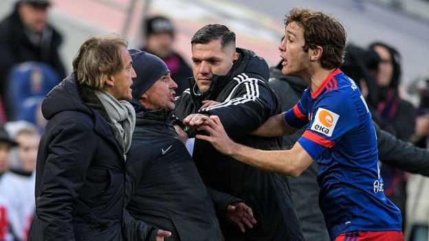 Самый запоминающийся эпизод состоялся на 11-й минуте: Мариу Фернандес при попытке прессинга на чужой половине задел ногу Кришито, а потом налетел с руганью на ассистента судьи, поднявшего флажок и сорвавшего опасную атаку. К месту событий тут же прилетели все 22 футболиста и даже Манчини, с которым защитник красно-синих немедленно и вступил в перепалку. Если бы резервный арбитр Игорь Федотов не выступил в роли миротворца, то могла начаться настоящая драка.