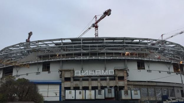 ... Выхожу из метро и тут же ощущаю себя на огромной стройке. Новый каркас крыши над историческим западным фасадом с буквами Д И Н А М О. Эта трибуна – единственная, дошедшая до нас практически нетронутой с 1928 года – года рождения стадиона – отреставрирована и вписана в воссозданный периметр стены. Над ней возвышаются новые конструкции спорткомплекса.