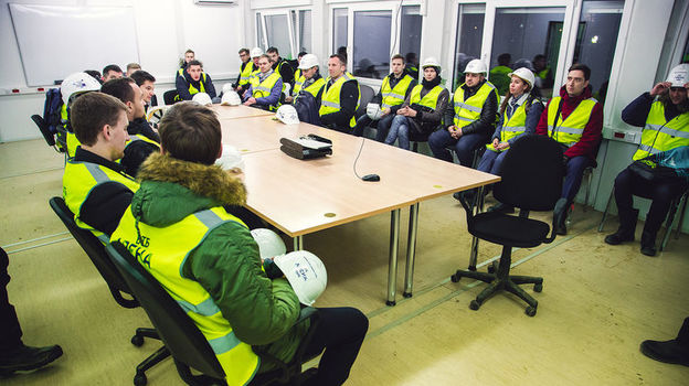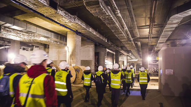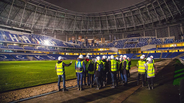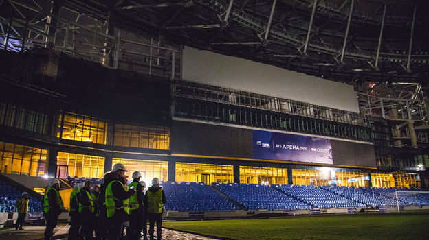Проходим через КПП на территорию строительного городка. Выслушиваем инструктаж. Каждый расписывается, что ознакомился с правилами техники безопасности. Уже стемнело, но свет от многочисленных прожекторов не мешает ощутить грандиозный масштаб проекта, когда мы подходим к стенам арены. А уж когда заходим внутрь...
