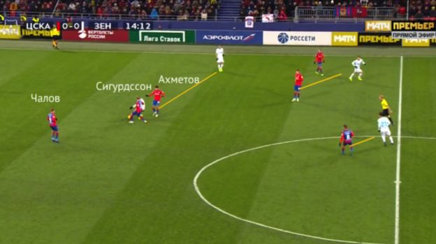 ЦСКА в начальной фазе атаки: Бистрович опускается вниз третьим для розыгрыша мяча, Ахметов и крайние защитники поднимаются для создания опций впереди, Дзагоев открывается в полуфланг, Влашич тоже смещается вправо.
