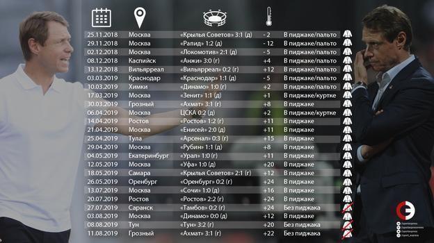 Мы изучили, что до 27 июля Кононов, будучи во главе "Спартака", был в пиджаке абсолютно на всех матчах команды. Даже на тех, когда температура была выше, чем в Туне или в Грозном. Например, в Оренбурге 26 мая днем, когда "Спартак" проводил матч 30-го тура чемпионата России, температура воздуха составляла не меньше 24 градусов (в какой-то момент даже прогрелась до 26 градусов). Однако Кононов пиджак не снял. Так же было и в Ростове 20 июля. Игра проводилась вечером, когда было примерно +24. А днем было +30, тем не менее главный тренер "Спартака" все равно вышел на игру в пиджаке.