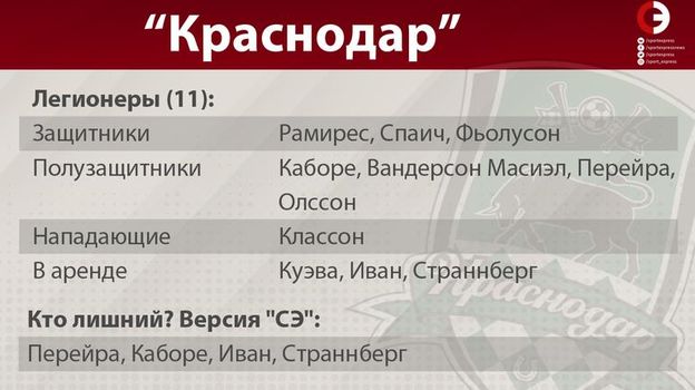 На сегодня у "быков" ровно восемь иностранцев в заявке. Перейра летом покинет клуб, у Каборе летом истекает контракт – его агент в феврале говорил, что африканец открыт для переговоров. Летний новичок Фьолусон целый год сидит на скамейке запасных – на его позиции в центре обороны играют Спаич и Мартынович. Куэва зимой ушел в аренду, так как в нынешнем формате на поле ему места нет, но при формуле "8+17" перуанец должен играть. Иван и Страннберг – сами по себе недотягивают до уровня "Краснодара".
