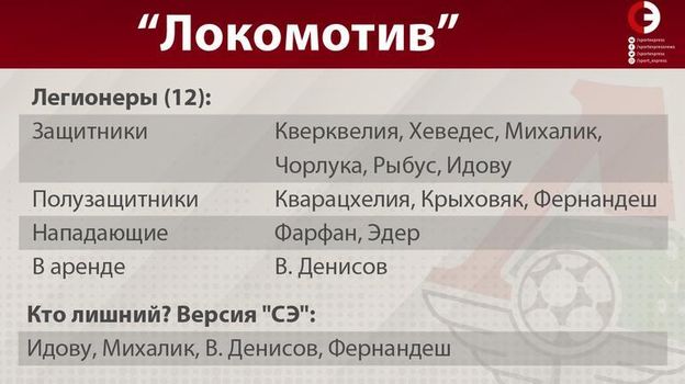 У "Локомотива" тоже много иностранцев, причем линия обороны почти полностью состоит из них – только у Игнатьева и Лысова нет легионерского статуса. Недавний дебют Идову за сборную Нигерии лишил его привилегий в РПЛ. С учетом статуса запасного, Брайн – один из главных кандидатов на вылет из заявки при схеме "8+17". Как и Михалик с Виталием Денисовым (у обоих летом истечет контракт).